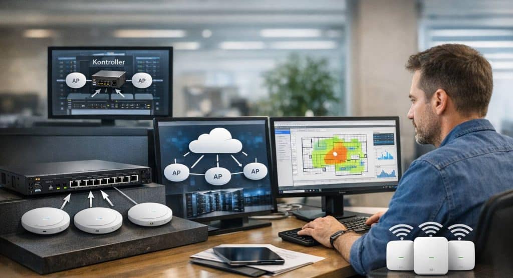 Ebben a modellben az access pointok egy központi vezérlőhöz (kontroller) csatlakoznak, amely kezeli a konfigurációt, a rádiós beállításokat és a klienskezelést. Ez lehet fizikai eszköz vagy virtuális megoldás. Előnye a centralizált irányítás, a konzisztens konfiguráció és a fejlett funkciók, például a seamless roaming és a dinamikus csatornakezelés. Nagyvállalati környezetben ez a leggyakoribb megoldás.