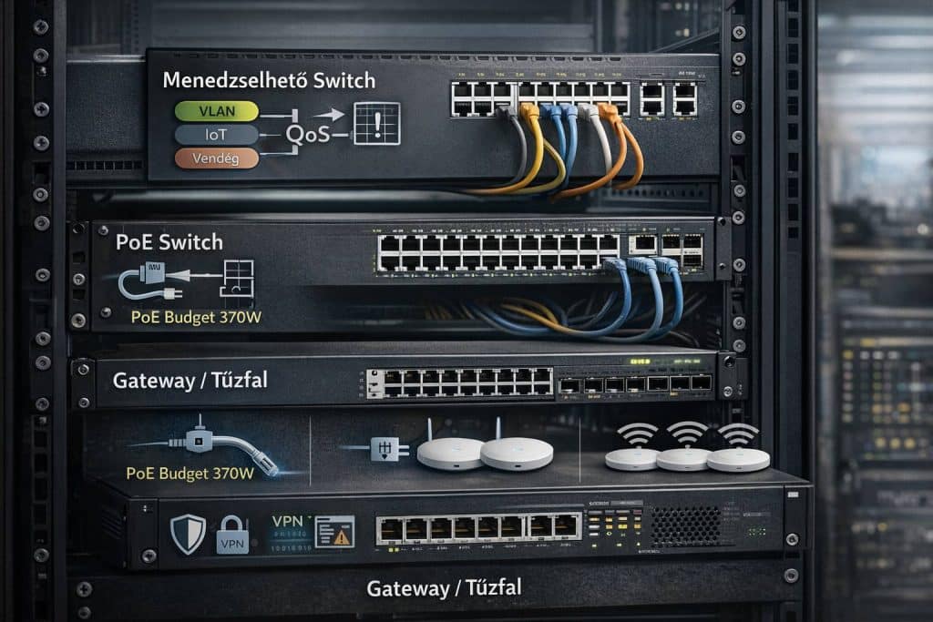 A WiFi infrastruktúra nem önállóan működik, hanem a teljes hálózati környezet részeként. A megfelelő háttéreszközök biztosítják a stabil adatátvitelt, a tápellátást és a biztonságot.